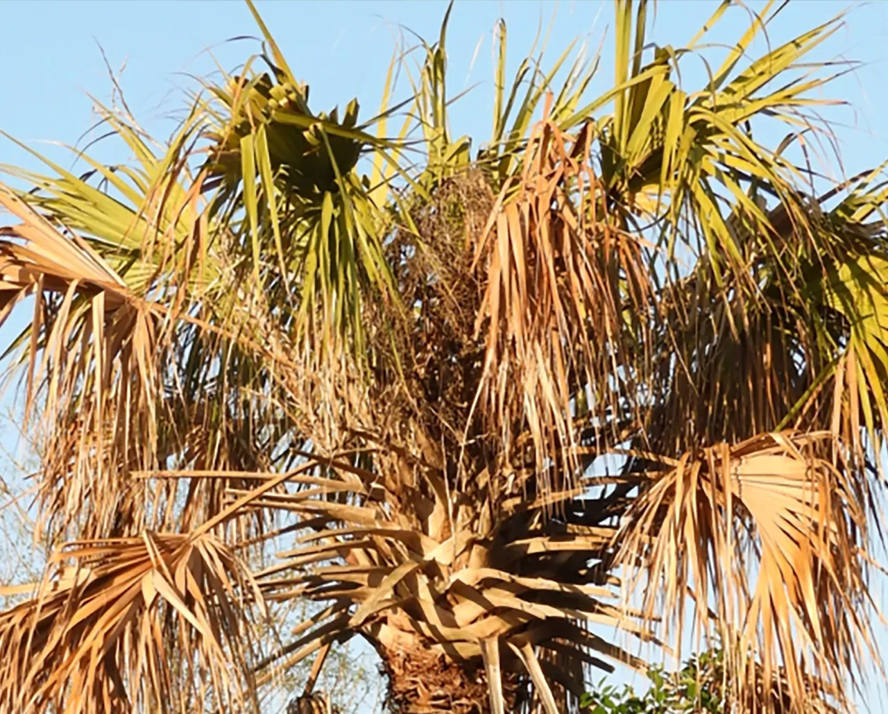 The second, and more alarming, is Texas Phoenix Palm Decline (TPPD), also known as Lethal Bronzing Disease, a phytoplasma disease that is fatal if not caught and treated early. Both conditions are difficult to detect without professional inspection and require prompt action to have any chance of saving the palm.