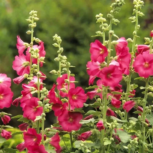 Tall, dramatic spires that add height and cottage charm to fences or back borders.